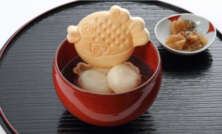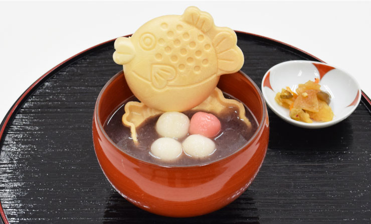 出雲発祥のぜんざいに、福を呼ぶ「ふぐの最中」を添えた縁起の良い一椀です。甘さ控えめのぜんざいに、お餅を入れ、見た目も可愛いふぐの形の最中をトッピングしました。